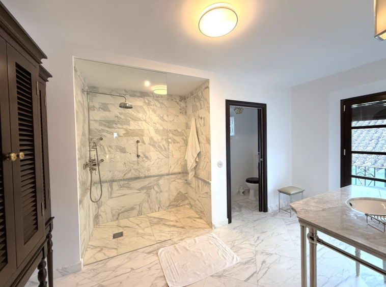 Upstairs you will find a very opulent and grand master bedroom suite with juliette balconies overlooking the terrace below and the cobbled streets. There is a dressing room and a very large luxurious fitted bathroom with additional storage. The lift also goes up to this level.