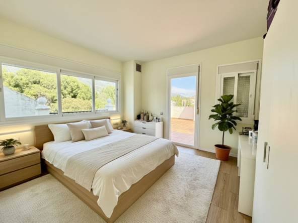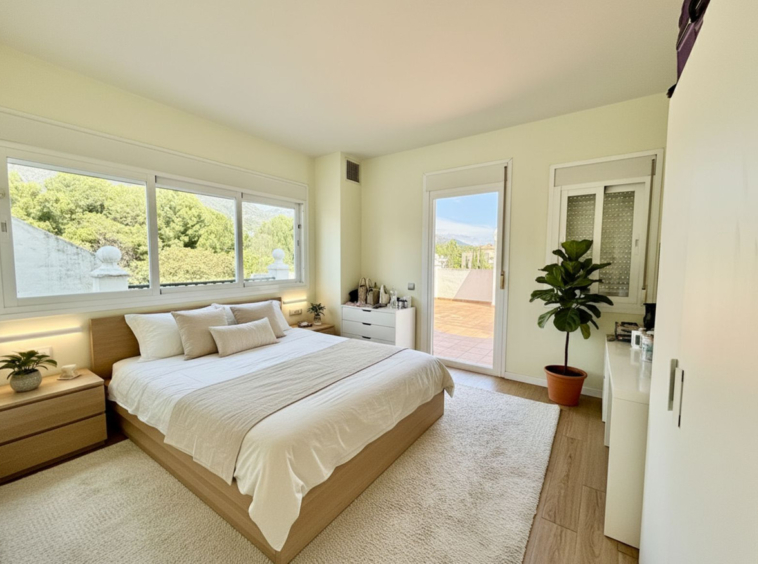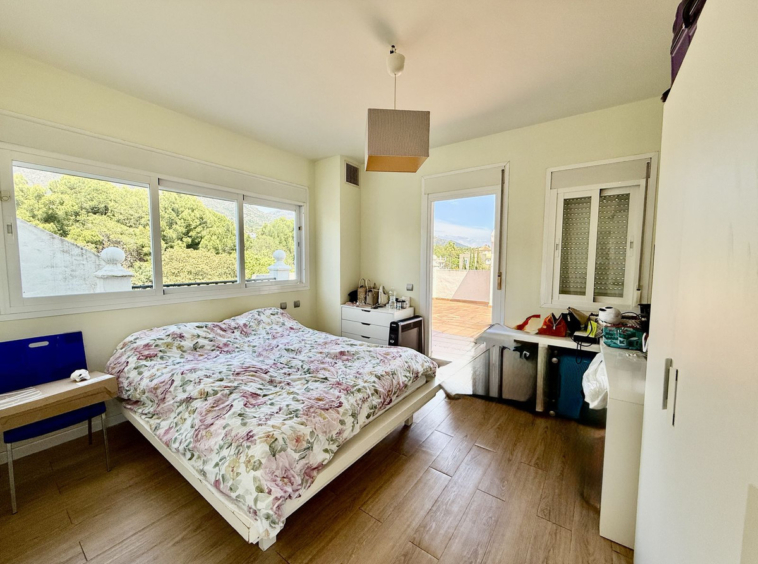 The property has a very independant feeling to it when you enter the courtyard where the front door is. You enter into the living area which is multi level and has feature beams in the bright dining area which overlooks a very spacious and South facing terrace. There is a galley kitchen along with a bedroom and a bathroom on this level. Upstairs you have a second bedroom and bathroom which is a very large space, plus access to a private solarium terrace very large in size with stunning mountain and panoramic sea views, ideal for sunbathing, relaxing, or creating a chill out space.