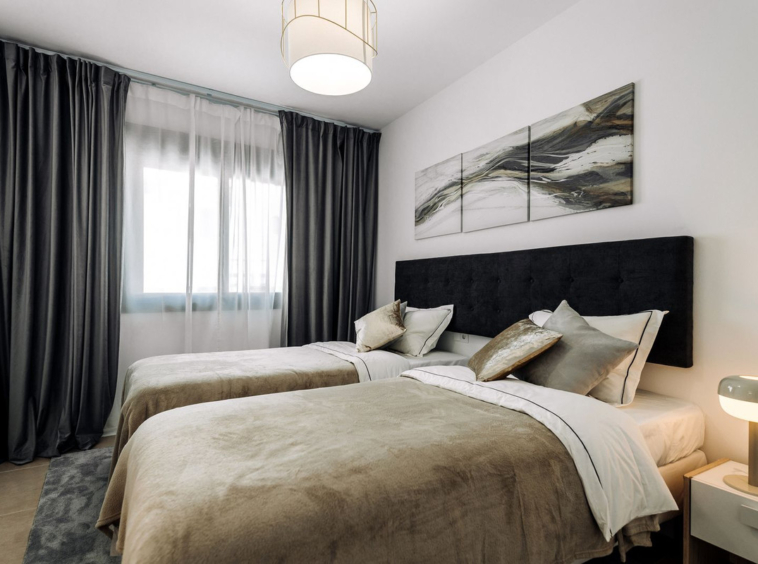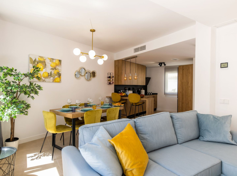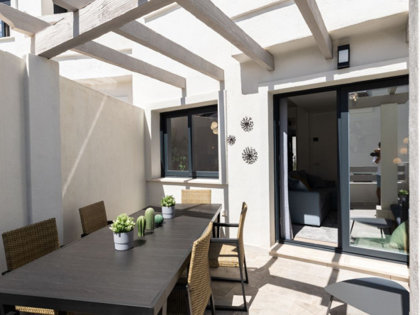 A brand new 3 bedroom 3 bathroom townhouse with large basement area. A lovely property located in El Campanario which is famed for its wonderful golf course and club house where you will find a super restaurant, gym, indoor and outdoor pool and spa area along with a hairdresser and beauticians. The development has a salt water pool and an additional pool for children. The house is lovely and bright. There is a large open plan living and dining room with american style kitchen. Doors lead out onto a large East facing terrace where you will have early to mid day sun. On this level there is another terrace at the front that is extremely large in size with a pergola and nice seating area and is West facing where you will get afternoon and evening sun. There is a guest bedroom and shower room on this level.